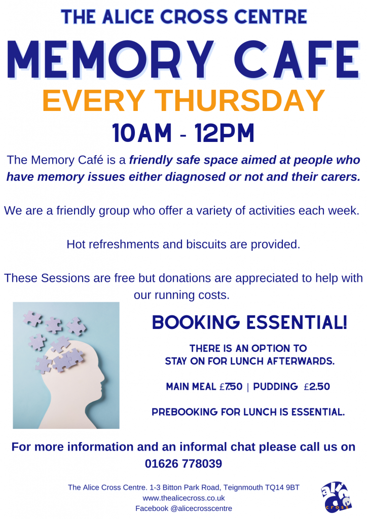 Held every Thursday (10am – 12pm) at the Alice Cross Centre in Teignmouth, the café offers a relaxed, supportive environment where guests can enjoy conversation, activities, and refreshments in the company of others who understand. It’s a place to share experiences, find friendship, and access helpful information and resources in a friendly, dementia-aware setting.