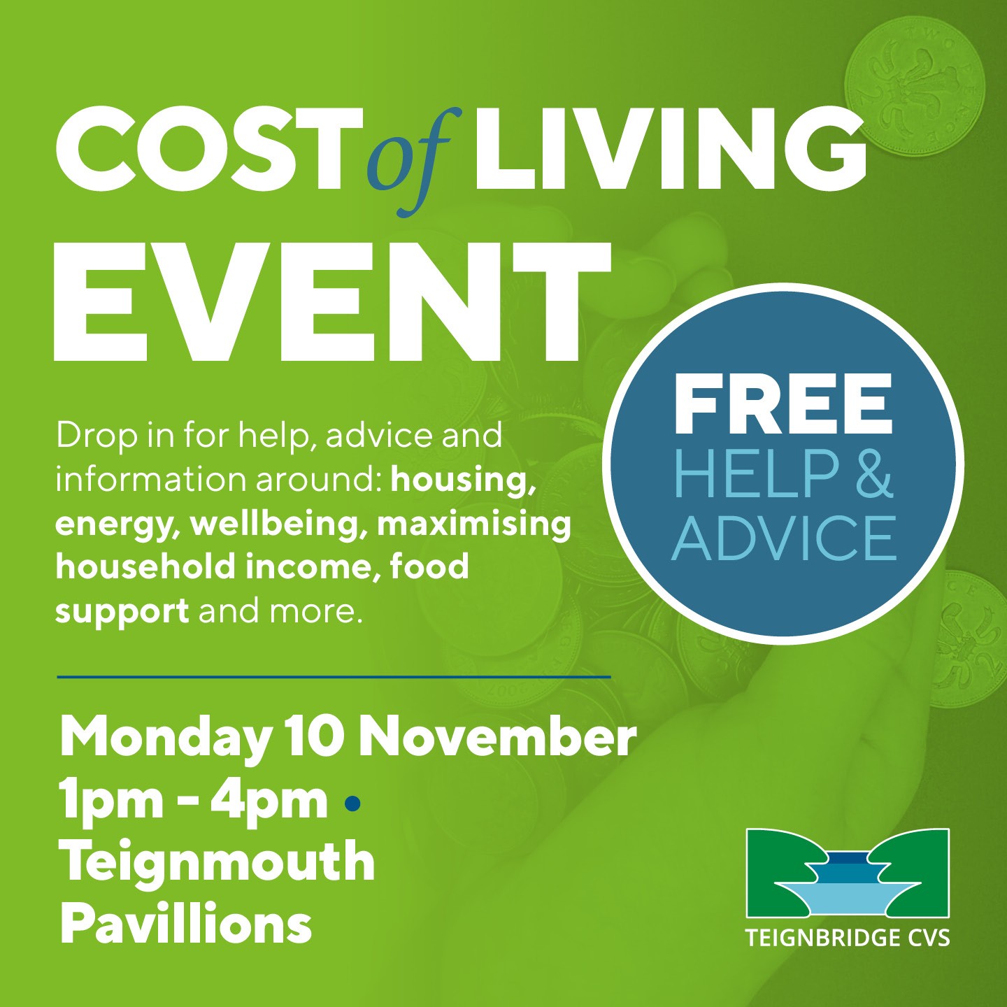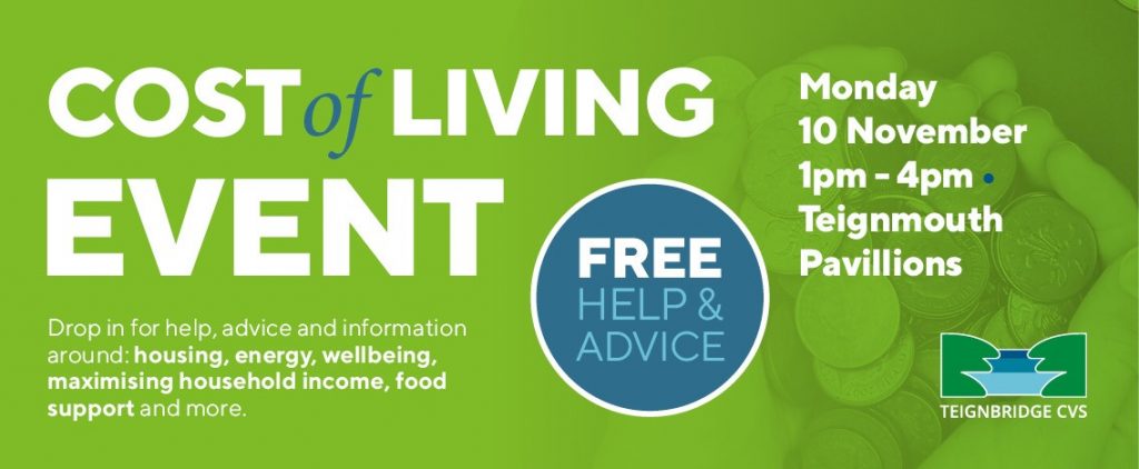 As winter approaches and we begin switching the heating back on, living costs are once again rising. Teignbridge CVS is running a series of free, one-stop Cost of Living events, in partnership with a range of local organisations offering information and support. These include The Alice Cross Centre, Citizens Advice Teignbridge, Teign Housing, South West Water, Teignbridge District Council, ECOE, local food support providers, and health & wellbeing organisations.