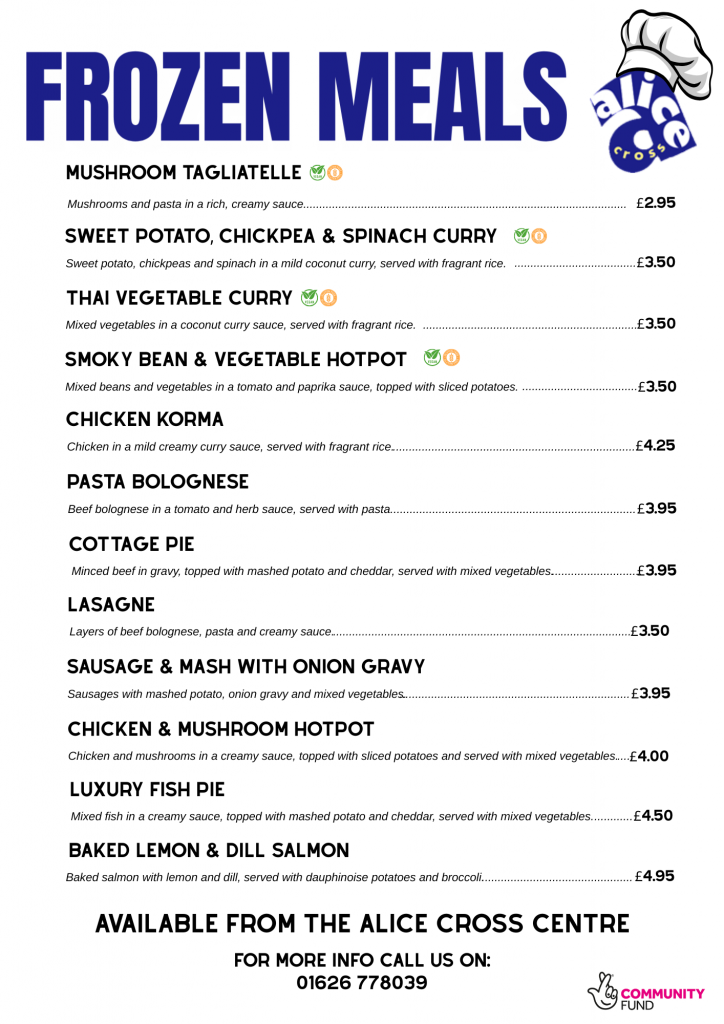 Meals are available to buy directly from the centre or for delivery if you are on our meal delivery round. Give us a call on 01626 778039 or pop in and take a look at the freezer!