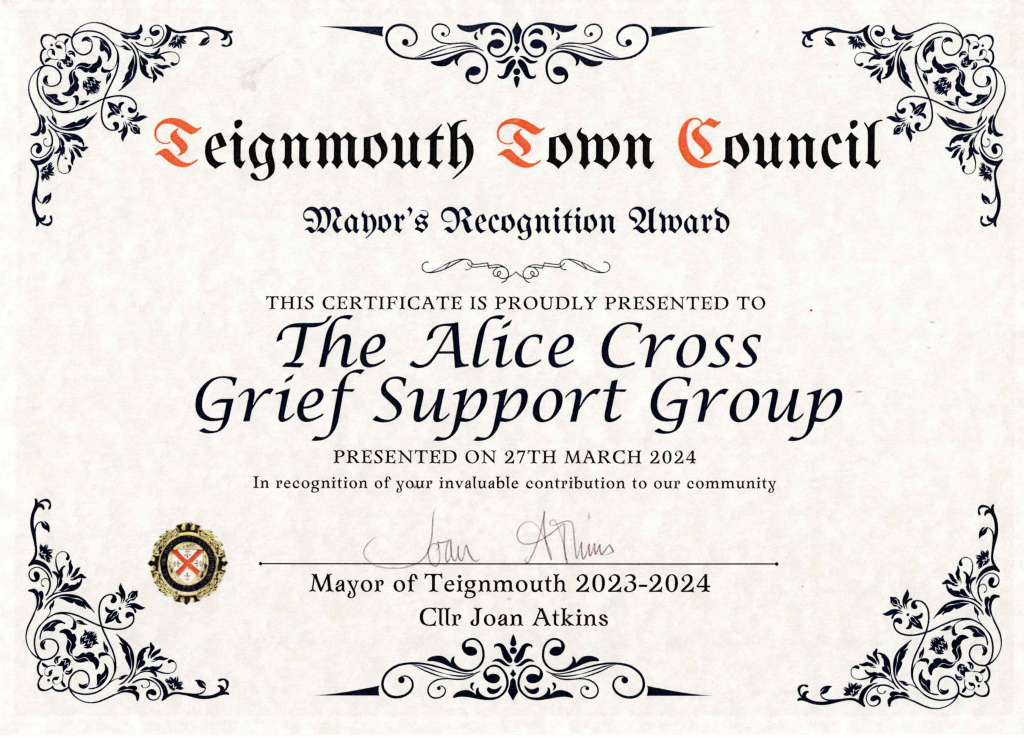 Our wonderful Bereavement Peer Support Group have been recognised by the Mayor of Teignmouth for their terrific work in our community.