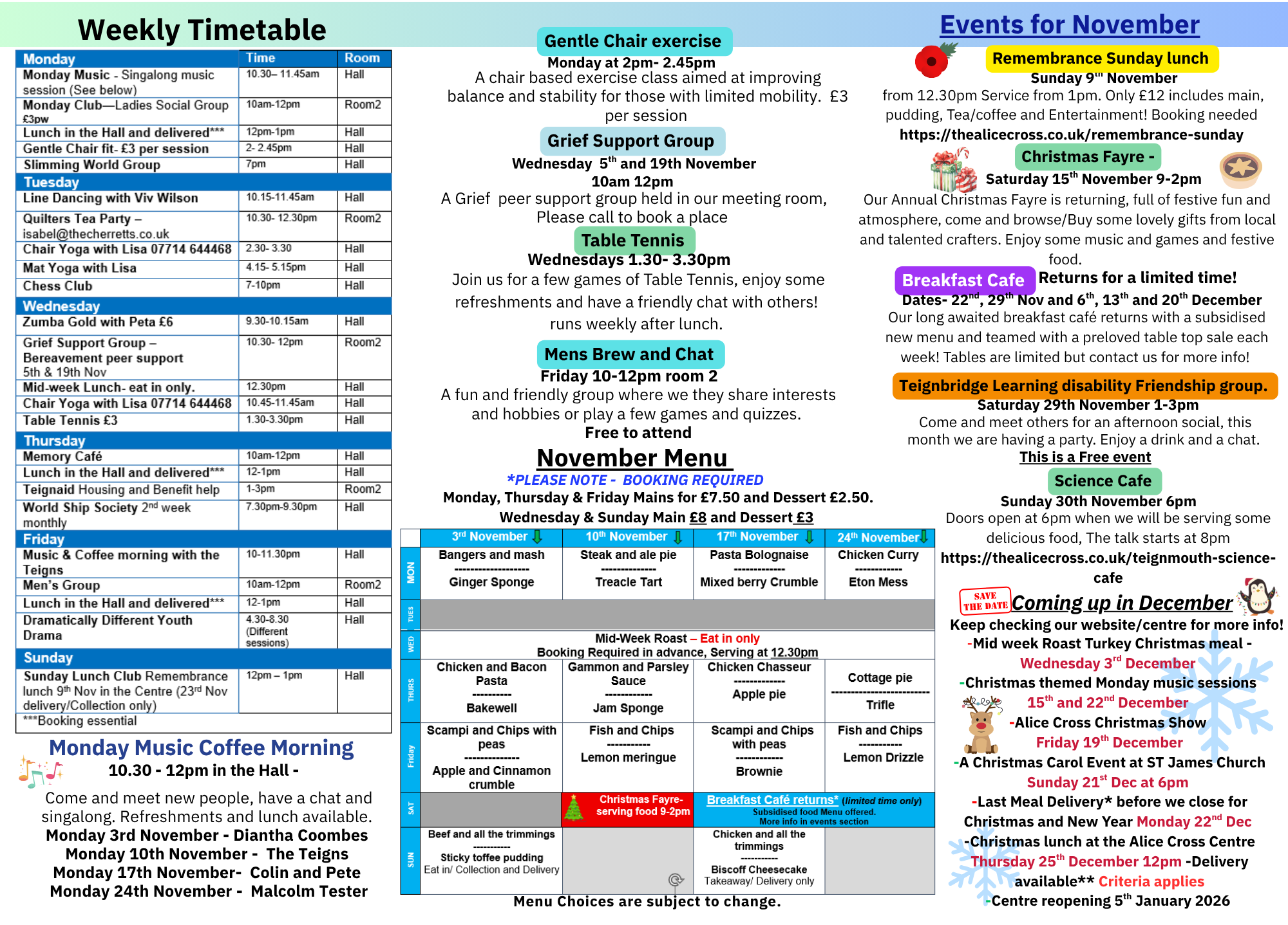 Please read and download our November Newsletter. It includes details of what’s happening each weekday but also the menu for the month!