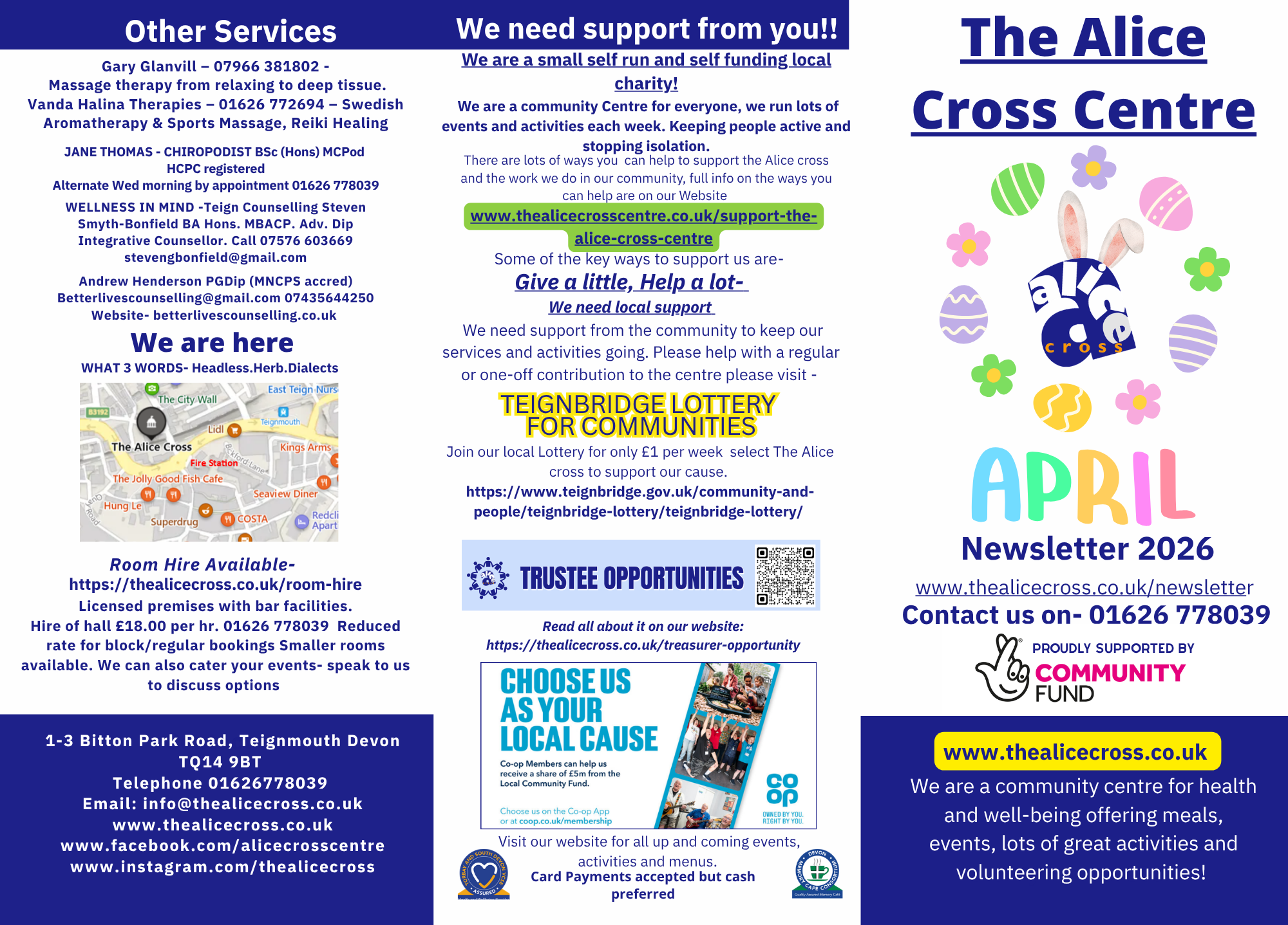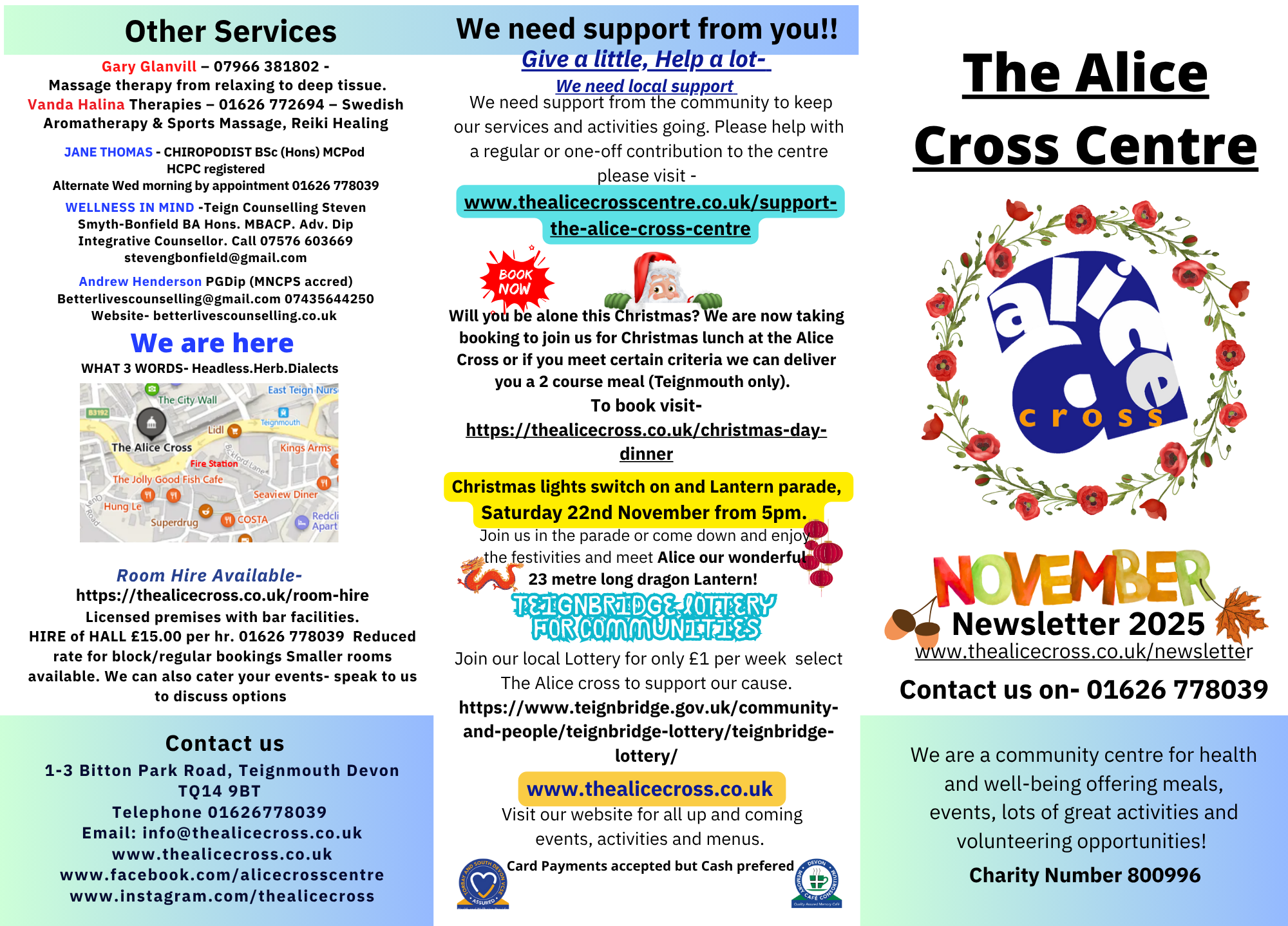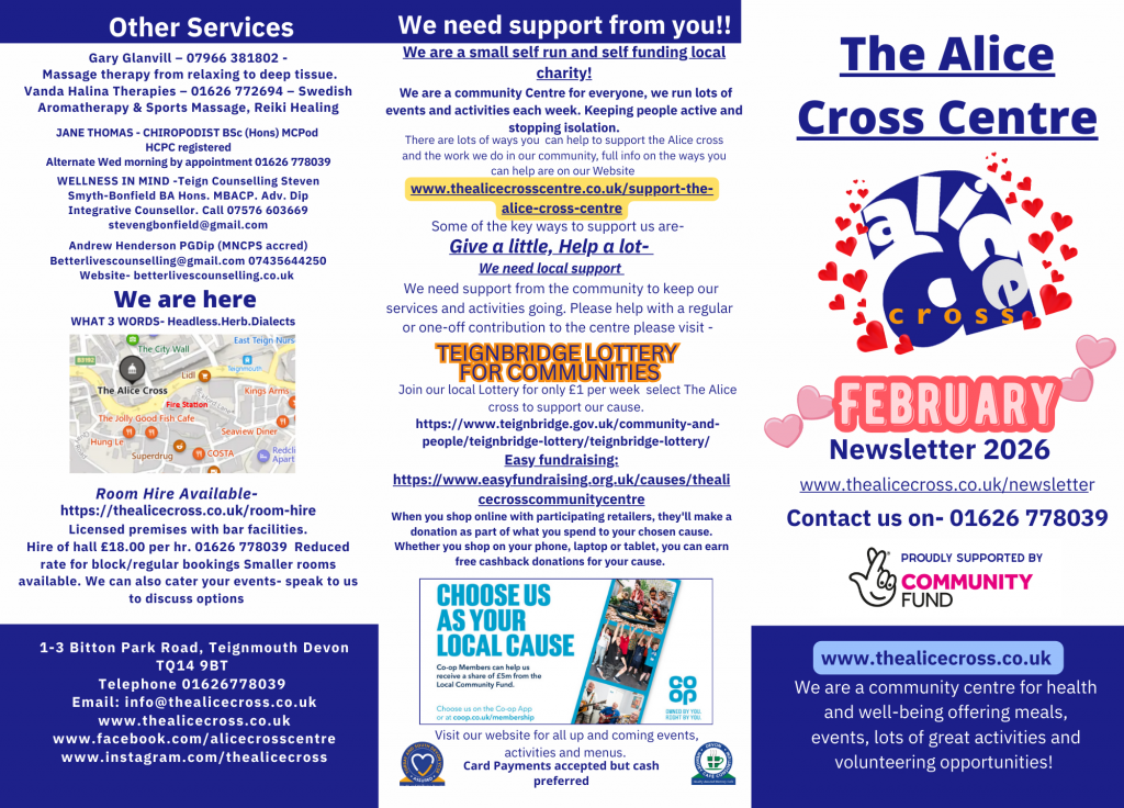 All information is reproduced in good faith. The Alice Cross Centre cannot be held responsible for any errors or omissions.
