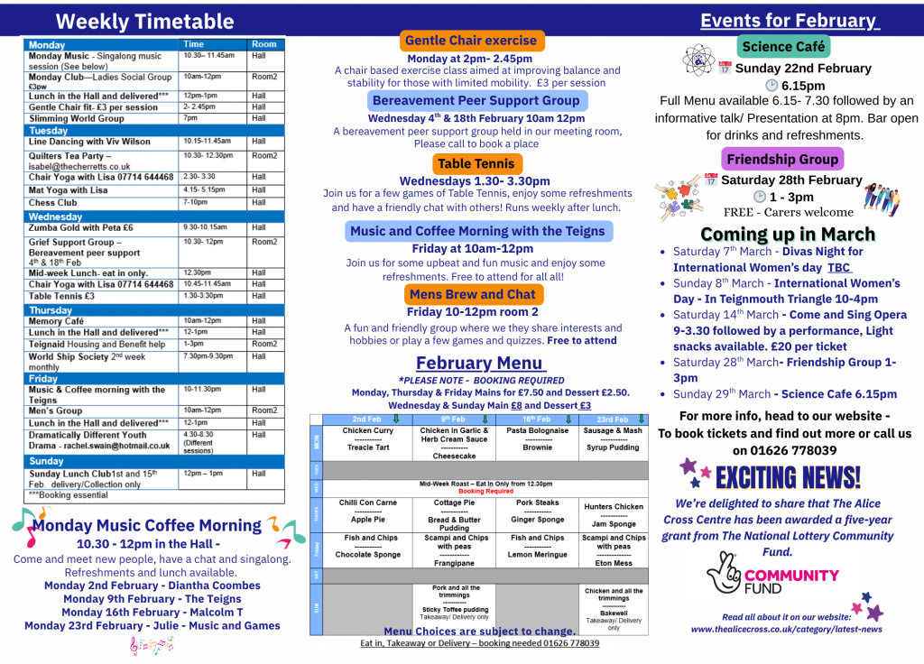 Please read and download our February Newsletter. It includes details of what’s happening each weekday but also the menu for the month!