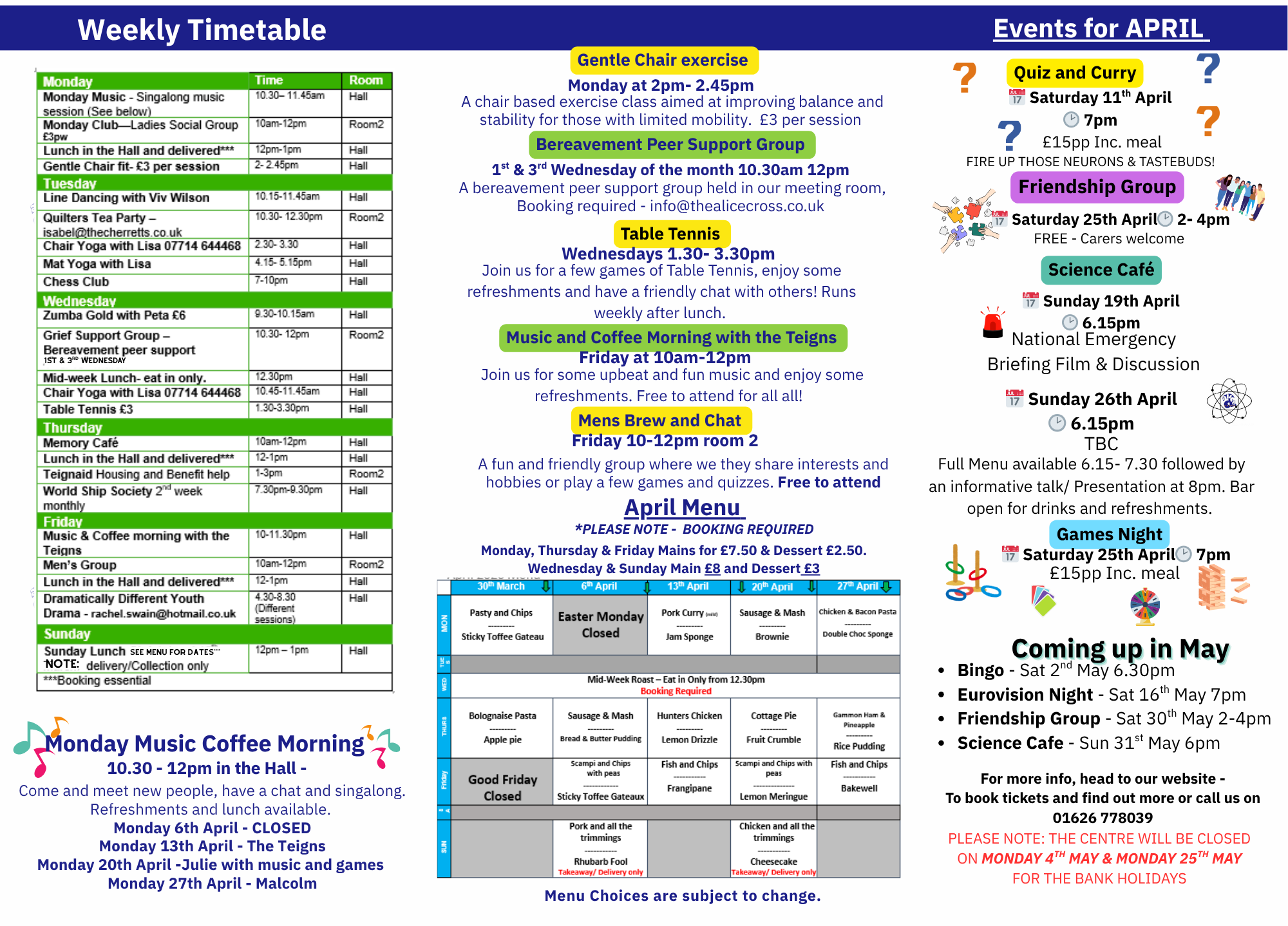 Please read and download our April Newsletter. It includes details of what’s happening each weekday but also the menu for the month!