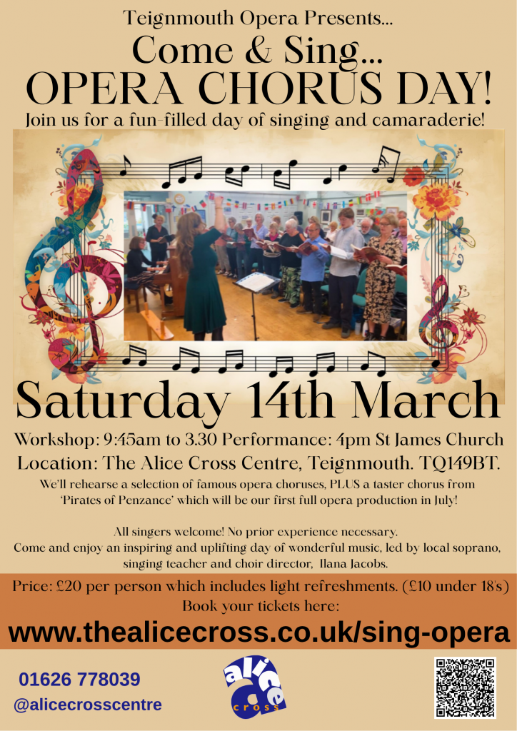 The day was led by Ilana Jacobs, who trained Operatically at the Royal Northern College of Music, and is well-known locally as Musical Director of Teign Choral, Brixham Male Orpheus Choir, Teignmouth Youth Choir and the Rowcroft Choir. Her energy and expertise brought singers of all levels together, with many attendees from local choral societies keen to experience the thrill of singing opera choruses in a large group.